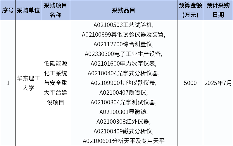 華東理工大學(xué)2025年7至12月政府采購(gòu)意向,預(yù)算金額5000萬(wàn)。