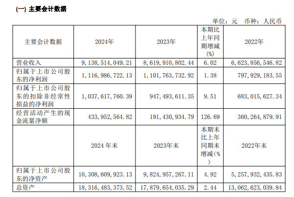 該公司營業(yè)收入達(dá)91.39億元,同比增長6.02%;歸母凈利潤為11.17億元,同比增長1.38%;扣非歸母凈利潤10.38億元,同比增長9.51%。