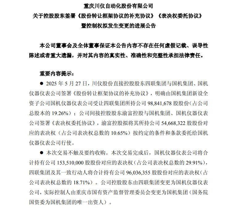 527日晚間,川儀股份(603100)公告,527日,公司直接控股股東四聯集團與國機集團、國機儀器儀表公司簽署《股份轉讓框架協議的補充協議》,明確由國機集團新設全資子公司國機儀器儀表公司受讓四聯集團所持公司98,841,678股股份(占公司總股本的19.26%);公司間接控股股東渝富控股與國機集團、國機儀器儀表公司簽署《表決權委托協議》,渝富控股擬將其所持公司54,668,322股股份對應的表決權(占公司表決權總數的10.65%)按約定的條件和條款委托給國機儀器儀表公司行使。