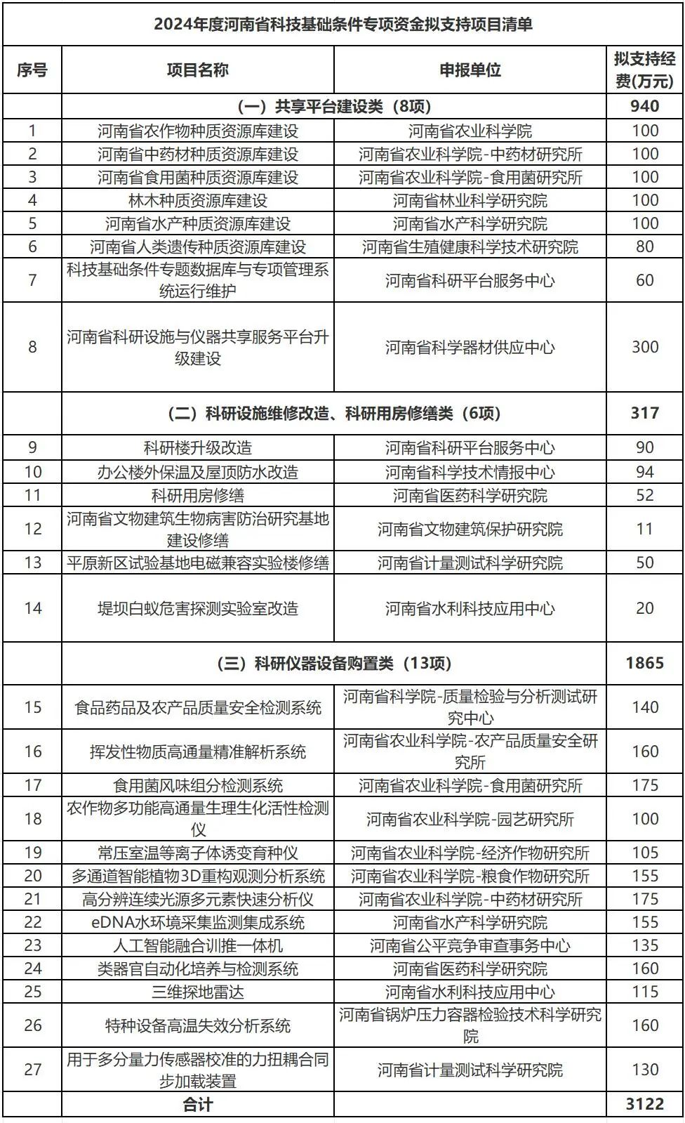 河南省科技基礎條件專項資金3122萬元