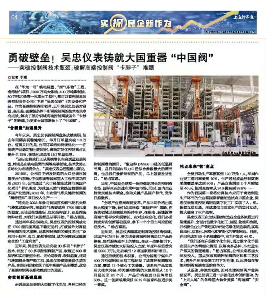 從跟跑、并跑到領(lǐng)跑,面對全球控制閥產(chǎn)業(yè)深刻變革,吳忠儀表正進一步強化技術(shù)創(chuàng)新驅(qū)動,為“上天入地”的各種重大裝備提供“高端閥”“安全閥”。
