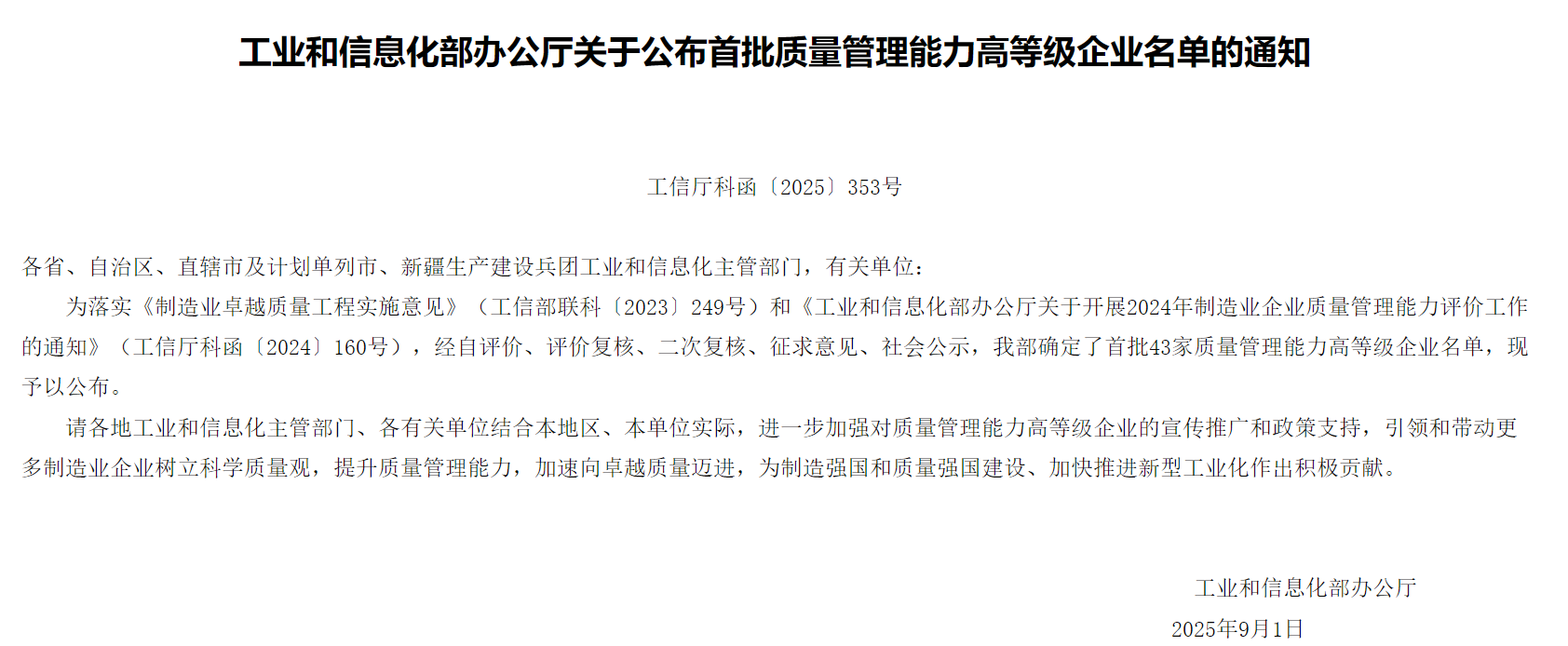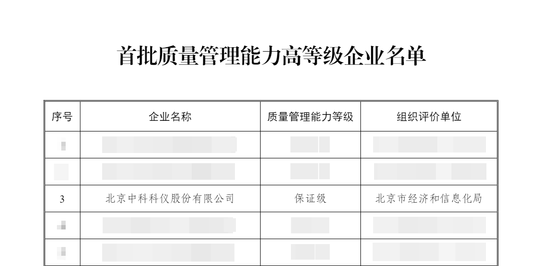 近日,工業和信息化部公布了首批43家質量管理能力高等級企業名單,北京中科科儀股份有限公司成功入選。