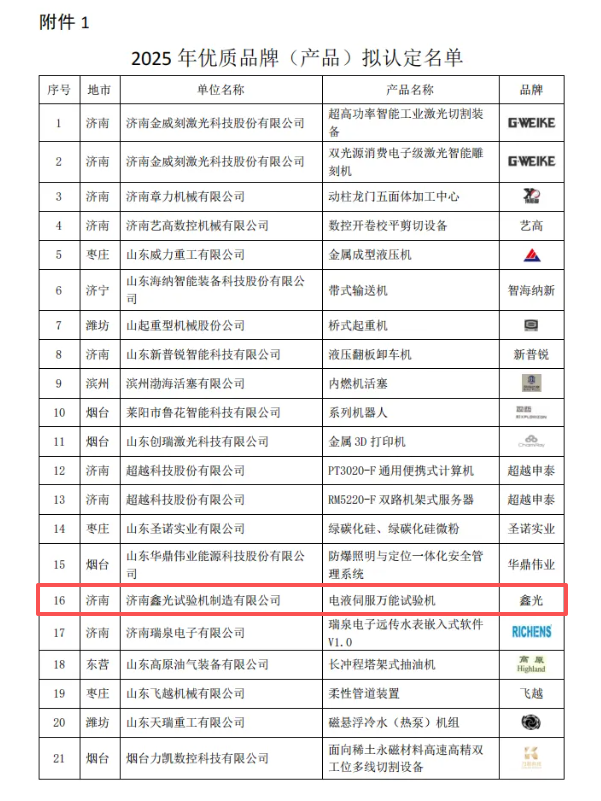 濟南鑫光電液伺服萬能試驗機獲山東省2025年優質品