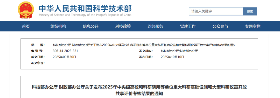 10月10日,科技部辦公廳、財政部辦公廳發(fā)布了《關(guān)于發(fā)布2025年中央級高校和科研院所等單位重大科研基礎(chǔ)設(shè)施和大型科研儀器開放共享評價考核結(jié)果的通知》。
