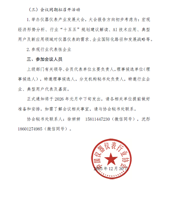 根據(jù)《中國(guó)儀器儀表行業(yè)協(xié)會(huì)章程》規(guī)定,經(jīng)中國(guó)儀器儀表行業(yè)協(xié)會(huì)(以下簡(jiǎn)稱(chēng)協(xié)會(huì))換屆工作領(lǐng)導(dǎo)小組研究決定,定于2026 年3月8-10 日召開(kāi)協(xié)會(huì)第九屆會(huì)員代表大會(huì)。現(xiàn)將會(huì)議有關(guān)事項(xiàng)預(yù)通知如下: