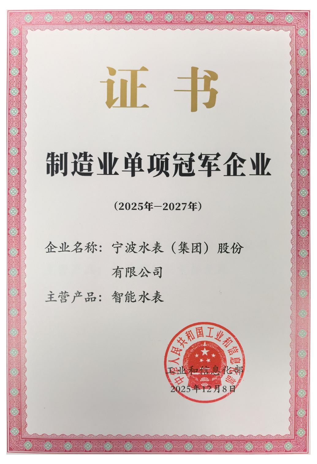 近日,工業(yè)和信息化部正式公布制造業(yè)單項(xiàng)冠軍企業(yè)復(fù)核通過名單,寧波水表(集團(tuán))股份有限公司(以下簡稱“寧水集團(tuán)”)再次榮膺國家級制造業(yè)單項(xiàng)冠軍企業(yè)稱號,成為行業(yè)內(nèi)唯一蟬聯(lián)該國家級榮譽(yù)的標(biāo)桿企業(yè)。此次復(fù)核成功,不僅是對寧水集團(tuán)在智能水計(jì)量領(lǐng)域全球領(lǐng)先地位的權(quán)威認(rèn)證,更是對企業(yè)構(gòu)建并持續(xù)深化技術(shù)、制造與品牌全方位核心競爭力的國家級認(rèn)可。