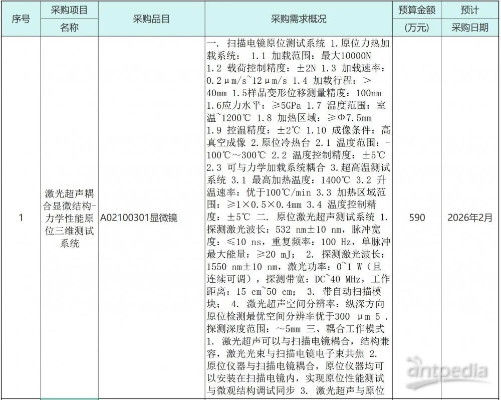 本次采購的“激光超聲耦合顯微結(jié)構(gòu)-力學(xué)性能原位三維測試系統(tǒng)”技術(shù)集成度高、指標(biāo)先進(jìn)。該系統(tǒng)要求能夠與掃描電鏡深度耦合,在微觀尺度下(如掃描電鏡腔內(nèi))實(shí)現(xiàn)對(duì)材料在極端條件(如-100℃至1400℃溫度范圍、高達(dá)5GPa的應(yīng)力水平)下的力學(xué)行為進(jìn)行實(shí)時(shí)、原位觀測,并同步結(jié)合激光超聲技術(shù)進(jìn)行亞表面缺陷與性能的無損檢測與三維成像。該系統(tǒng)的引入,將為新材料研發(fā)、微觀力學(xué)機(jī)制研究等前沿領(lǐng)域提供前所未有的“洞察力”。