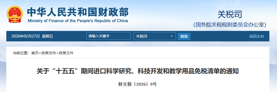 根據《財政部 海關總署 稅務總局關于“十五五”期間支持科技創新進口稅收優惠政策的通知》(財關稅〔20267號)和《財政部 中央宣傳部 國家發展改革委 教育部 科技部 工業和信息化部 民政部 商務部 文化和旅游部 國家衛生健康委 海關總署 稅務總局關于“十五五”期間支持科技創新進口稅收優惠政策管理辦法的通知》(財關稅〔20268號)有關規定,現將“十五五”期間進口科學研究、科技開發和教學用品免稅清單(見附件)予以公布,自202611日起實施。