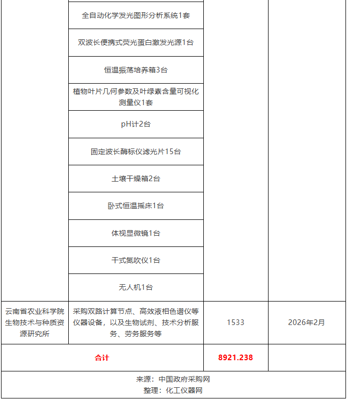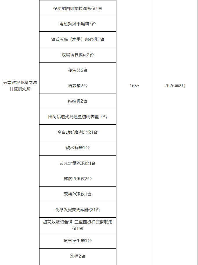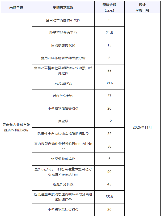 近期,云南省農業科學院多家院屬單位發布2026年儀器設備采購意向,計劃采購全自動智能固相萃取儀、自動核酸提取儀、熒光顯微鏡、近紅外分析儀、組織細胞破碎儀、紫外分光光度計、高速冷凍離心機、真空冷凍干燥機等儀器設備,預算總金額8921.238萬元。預計采購時間2026年2月~11月。