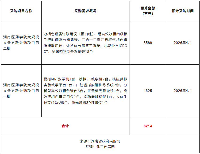 近日,湖南醫藥學院公布20262季度采購意向,計劃采購液相色譜質譜聯用儀、外泌體分離鑒定系統、核磁共振實驗教學平臺、分析型高效液相色譜儀、正置熒光顯微鏡、多功能酶標儀等47臺儀器設備,預算總金額8213萬元。預計采購時間20264月。
